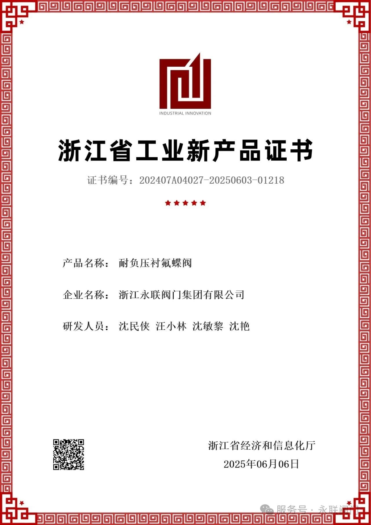 在沈民侠的带领下取得两项浙江省省级工业新产品“超低压力启闭零泄露止回阀”和“耐负压衬氟蝶阀”。